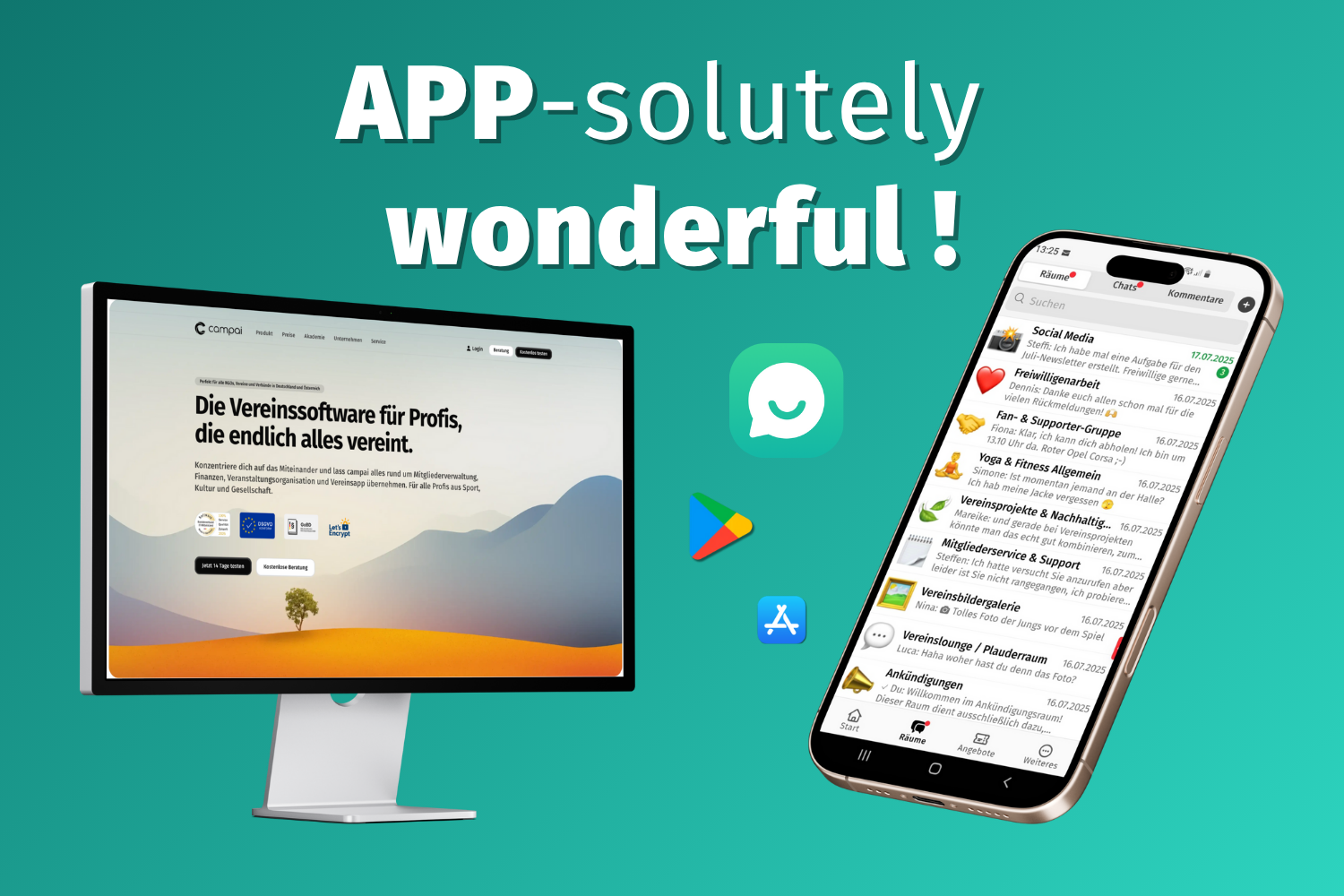 Konzentriere dich auf das Miteinander und lass campai alles rund um Mitgliederverwaltung, Finanzen, Veranstaltungsorganisation und Vereinsapp übernehmen. Für alle Profis aus Sport, Kultur und Gesellschaft.