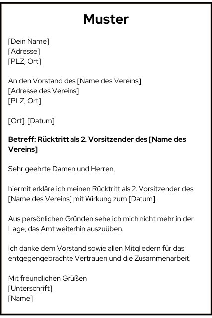 Hier findest du ein einfaches Muster für eine Rücktrittserklärung als 2. Vorsitzender: